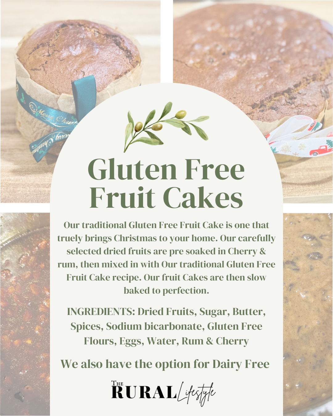 INGREDIENTS: Dried Fruits, Sugar, Butter, Spices, Sodium bicarbonate, Gluten Free Flours, Eggs, Water, Rum & Cherry